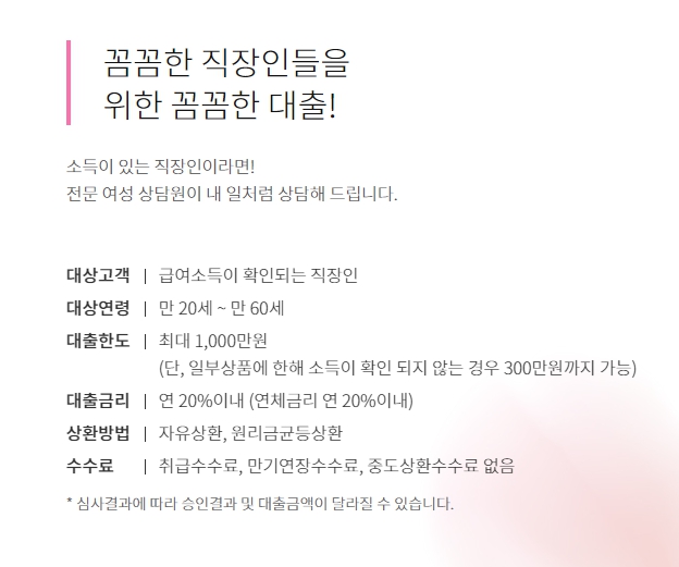 100만원에서 최대 3,000만원까지 이용이 가능하며 대출금리는 최고 연 20%까지 적용됩니다. 취급수수료 및 중도상환수수료는 없으며 최장 60개월까지 원리금균등분할상환 혹은 원금자유상환으로 이용이 가능합니다.